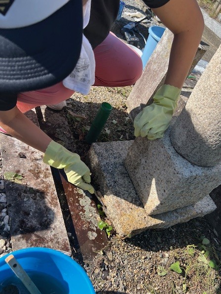 黒くこびりついたお墓の汚れ部分に、専用の薬剤を塗って、ブラシで丁寧に磨いています。